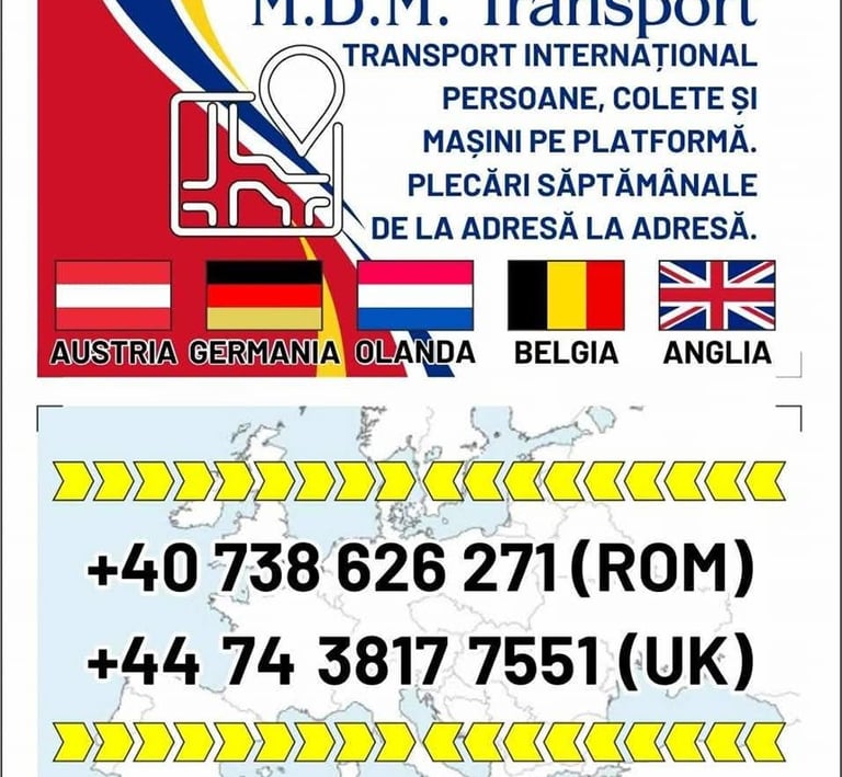 Cu o experiență solidă și o flotă modernă de microbuze, MDM Transport garantează siguranță, punctualitate și prețuri avantajoase pentru fiecare călătorie. Fie că vrei să trimiți un colet celor dragi sau să călătorești confortabil între România și Anglia, echipa noastră este pregătită să-ți ofere cea mai bună soluție.